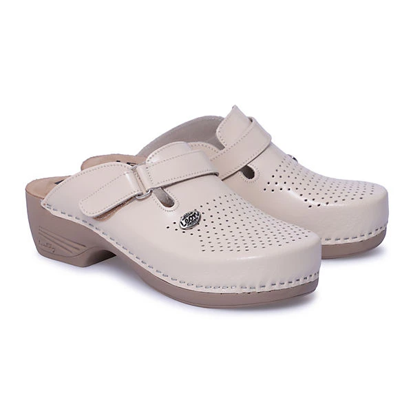 Anela, angelehnt an das Design der Holzclogs, vereint deren optischen Vorteile mit denen einer modernen und komfortablen PU-Sohle. Dank derer besitzt Anela eine hohen Dämpfungskomfort, der durch die weich gepolsterte Innensohle noch zusätzlich verstärkt wird. Das perforierte Obermaterial aus Leder sorgt für hohe Atmunsgaktivität und Tragekomfort. Dank des mit einem Klettverschluss verstellbaren Riemens, lässt sich der Anela an jeden Fuß anpassen. Komfort „Made in Europe“