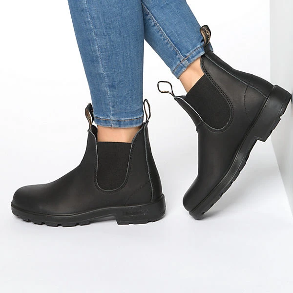 Die Blundstone Chelsea Boots sind mit zwei Anziehlaschen ausgestattet und im Zehen- und Fersenbereich verstärkt. Die flexible Profil-Laufsohle ist rutschhemmend.
