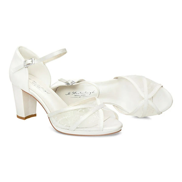Madeline ist ein besonderer, handgefertigter Hochzeitsschuh mit einem durchscheinenden Spitzenüberzug. Das Vorderteil ist mit einem romantischen Blumenmuster verziert. Dank mittelhohem Blook-Absatz und der Plateausohle bietet dieser Schuh den ganzen Tag himmlischen Komfort. Die weiche Gel-Polsterung und die Leder-Innensohle sorgen zudem für ein wirklich angenehmes Tragegefühl.