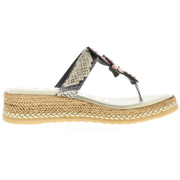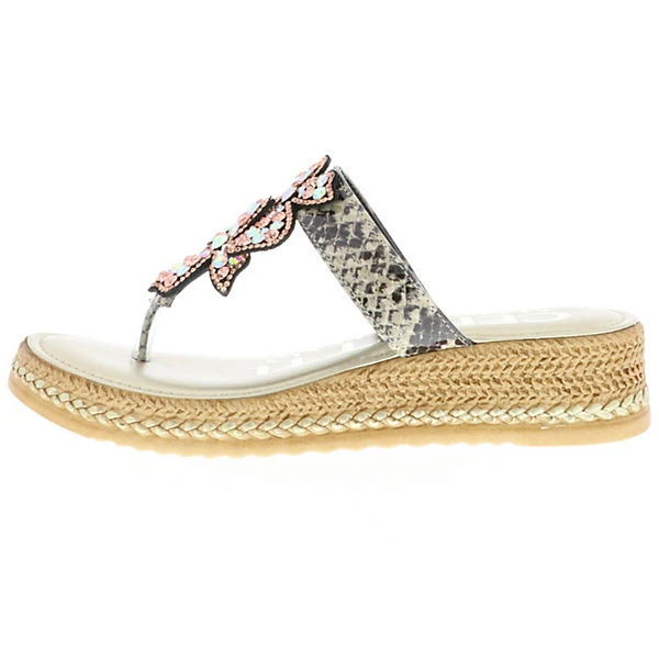 Die beiden weit nach hinten reichenden Riemen in Reptilienoptik sorgen mit den am Spann angebrachten Verzierungen mit Strasssteinchen und Ziersteinen für einen eleganten und besonders auffallenden und glänzenden Look. Das hochwertige Synthetik Obermaterial und die Softdecksohle bieten tollen Tragekomfort und sorgen für ein Wohlfühlerlebnis. Ob für einen besonderen Anlass, die Party am Strand oder den Einkaufsbummel in der Stadt oder im Urlaub, mit diesen Zehentrennern ist man immer perfekt gekleidet.
