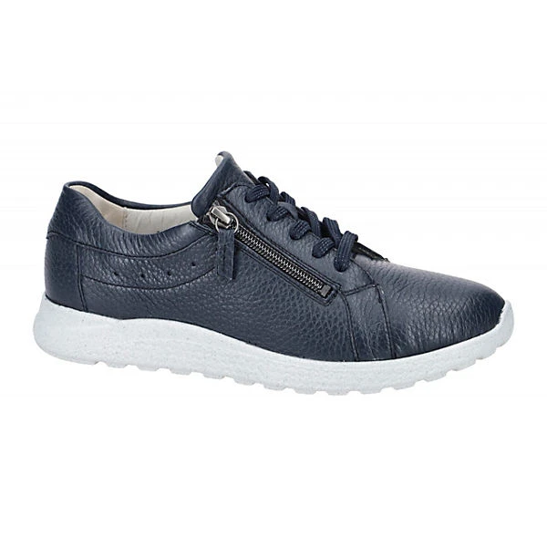 Hersteller: Waldläufer Hersteller Art-Nr.: 778004 199 194 Modellname: H-ALINA Machart: Damenschuhe – bequeme Schnür- Halbschuhe Farbe: dunkelblau + Sohle in hellgrau + blau gesprenkelt (notte) Obermaterial: Echtleder – Glattleder (Hirsch, extra weich) Innenfutter: Echtleder und Textil Innensohle: Echtleder Komfort Fußbett, recycelte Materialien Wechselfußbett: Ja – herausnehmbare Innensohle Laufsohle: PU-Laufsohle Verschluss: Schnürung und Reißverschluss Absatzart: flach – kein Absatz Schuhform: rund Größenhinweis: fällt normal aus Weitenangabe: H – Extra Weit