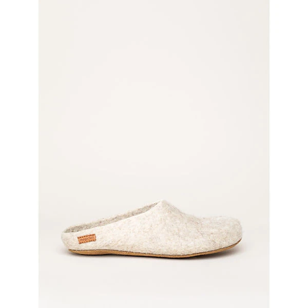 Ein anatomisch geformter Filzhausschuh, gefertigt aus der Wolle vom Tiroler Bergschaf und einer braunen Ledersohle. Die Kreuzung zwischen Tiroler Steinschaf und norditalienischem Bergamasker Schaf fühlt sich im rauen, alpinen Gebirgsklima besonders wohl. Bodenständige Farbmelierungen zeichnen die Wolle aus.