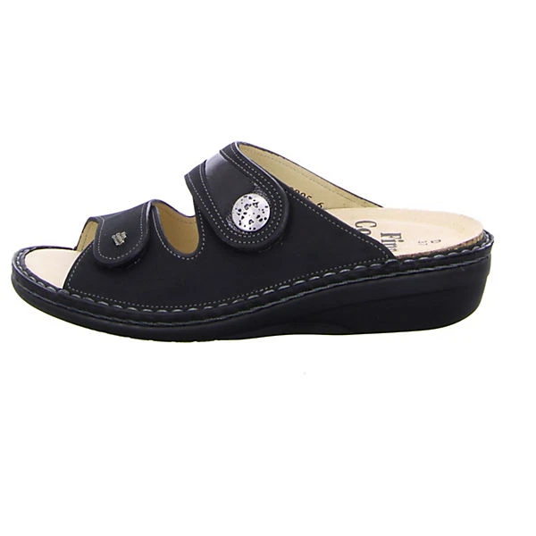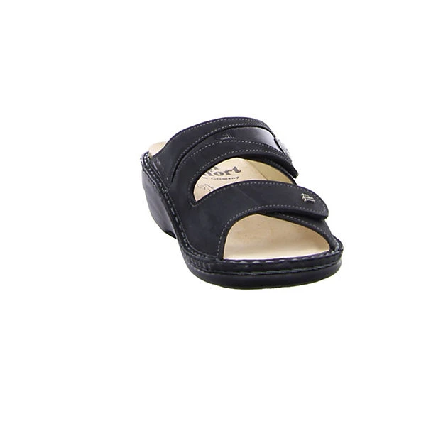 Damen Pantoletten von Finn Comfort aus angenehm weichen Birkoflor. Innen ist der Schuh mit einem cromfrei gegerbtem Leder ausgestattet. Der Schuh hat eine normale Weite. Der Keilabsatz hat eine Höhe von cirka 3 cm. Die Laufsohle ist aus Gummi. Die Schuhgröße fällt regulär aus.
