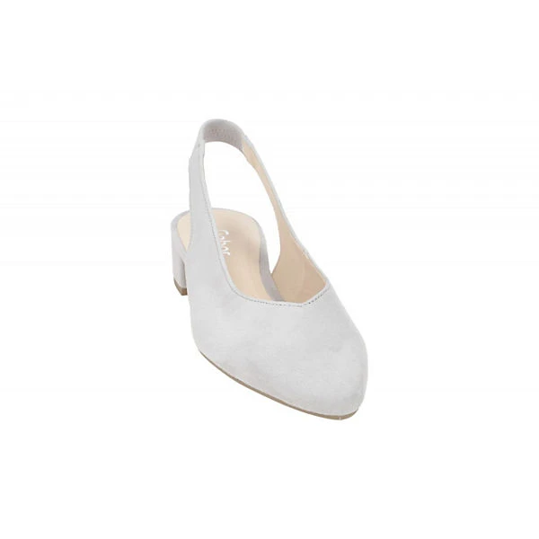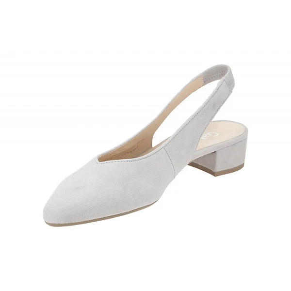 Hersteller: Gabor Hersteller Art-Nr.: 21.520.19 Modellname: 21.520 Machart: Damenschuhe – Sling Pumps Farbe: hellgrau + Sohle in braun (light grey) Obermaterial: Echtleder – Velour – Rauhleder (Samtchevreau) Innenfutter: Echtleder Innensohle: Echtleder – Fußbett Wechselfußbett: nicht herausnehmbare Innensohle Laufsohle: Gummisohle Verschluss: Gummizug – ohne Verstellmöglichkeit Absatzart: Blockabsatz Absatzhöhe: kleiner Absatz, ca. 3cm Schuhform: spitz Größenhinweis: fällt normal aus Weitenangabe: F – normal Weite