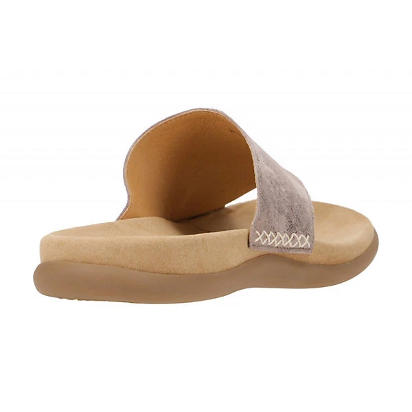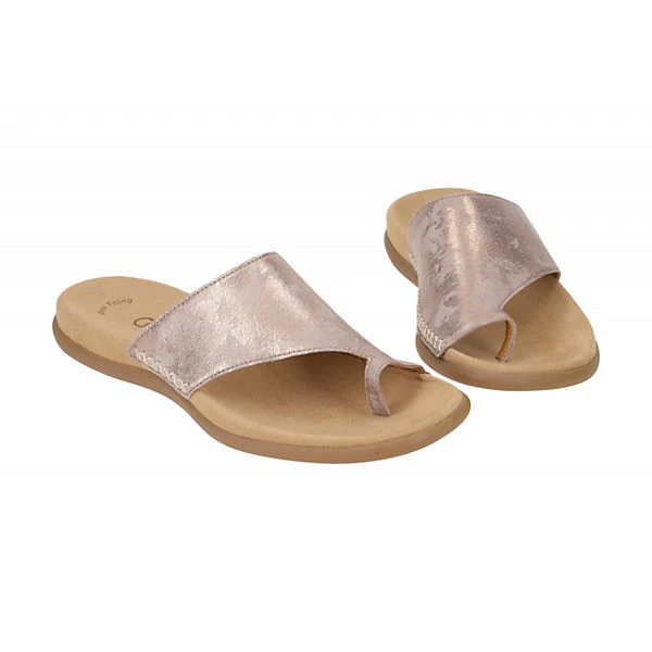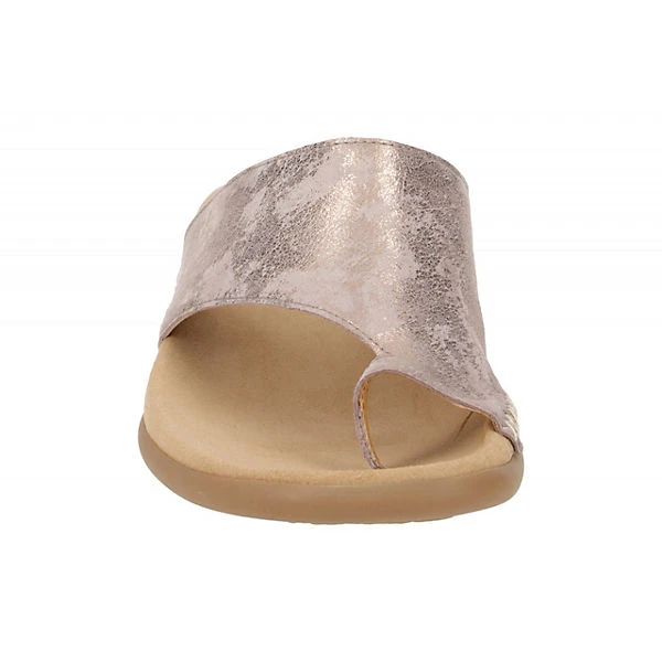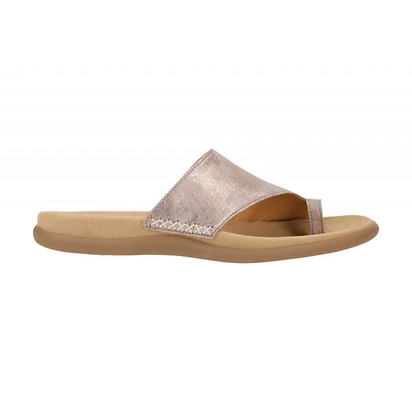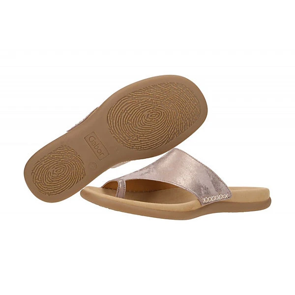 Hersteller: Gabor Hersteller Art-Nr.: 23.700.60 Modellname: 23.700 – Gabor BEST FITTING Machart: Damen Pantoletten – Zehentrenner Pantolette Farbe: rosa metallic + Sohle in braun (dark-rose) Obermaterial: Echtleder – Velour – Rauhleder (Caruso Metallic) Innenfutter: Echtleder Innensohle: Textil Komfort Fußbett Wechselfußbett: nicht herausnehmbare Innensohle Laufsohle: Gummisohle Absatzart: Keilabsatz / Wedge, 1cm Keil Schuhform: rund Größenhinweis: fällt normal aus Weitenangabe: F – normal Weite