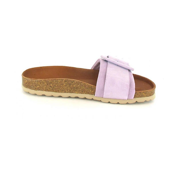 – modische Damen-Pantolette von Verbenas in der Trendfarbe Lila – weiches Obermaterial aus Leder, mit schöner Zierschnalle – lederüberzogenes Kork-Fußbett – rutschhemmende Laufsohle